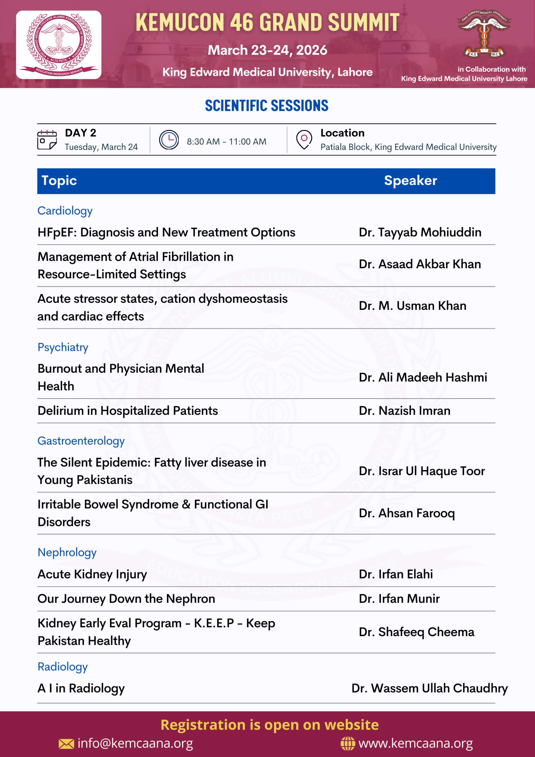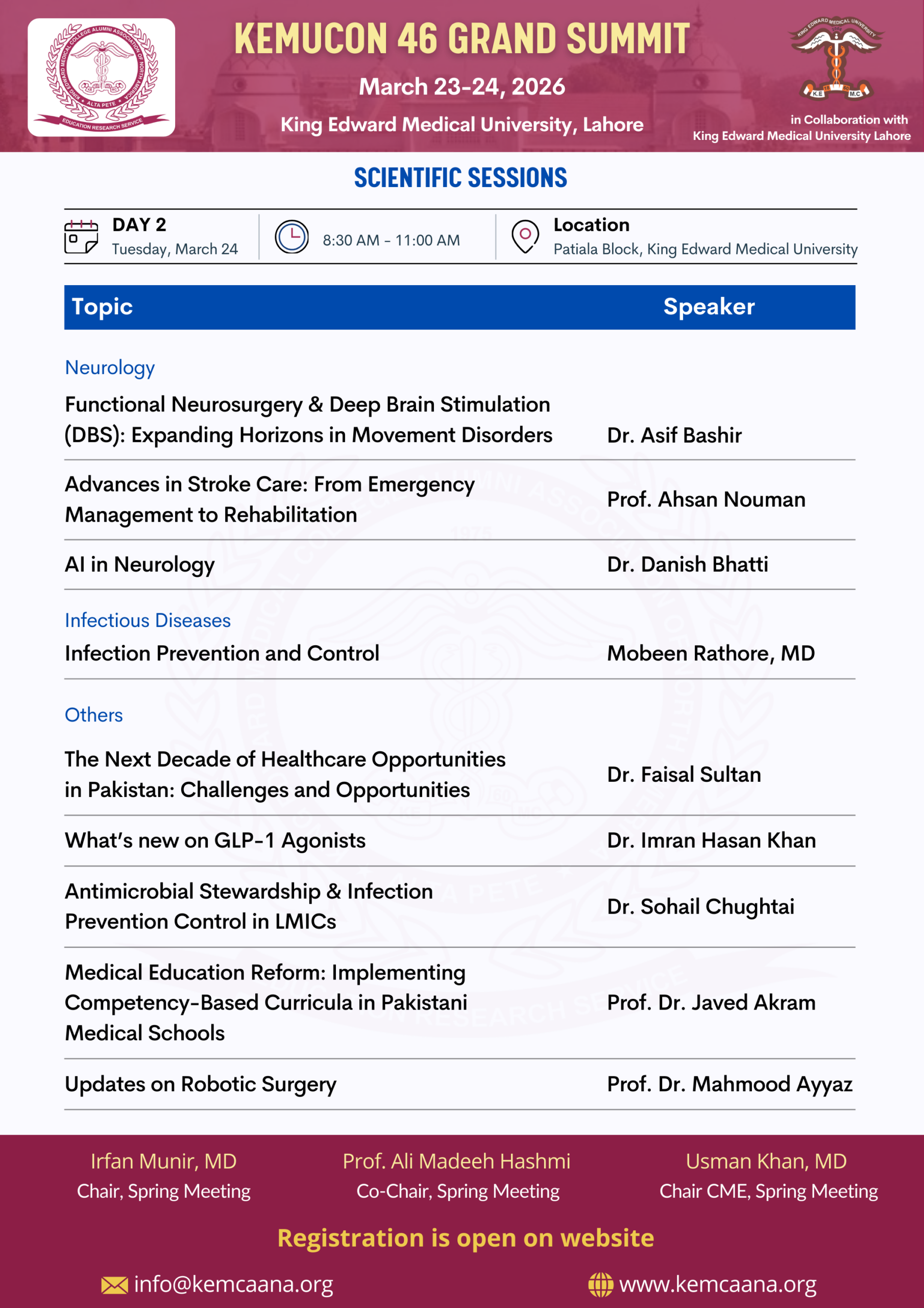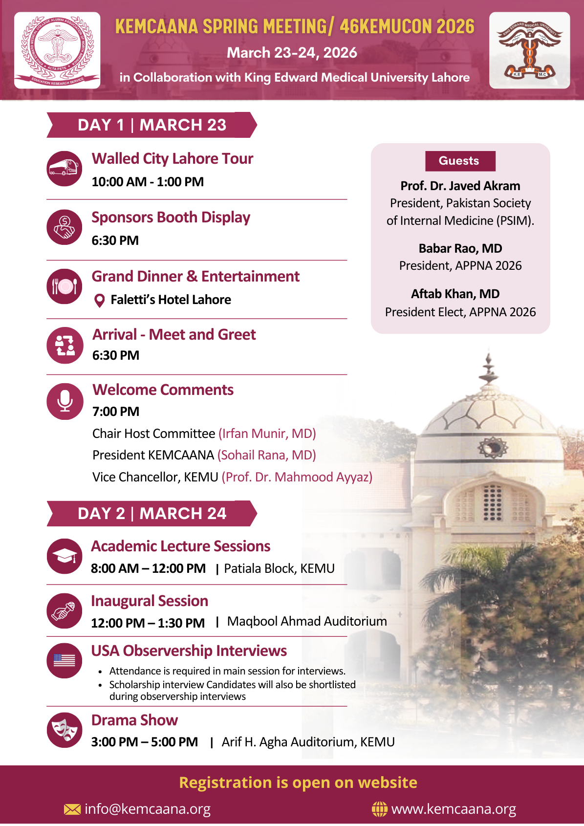 We are pleased to inform you to kindly save the dates for the KEMCAANA Spring Meeting 2026, scheduled to be held on March 23–24, 2026, at King Edward Medical University, Lahore.
